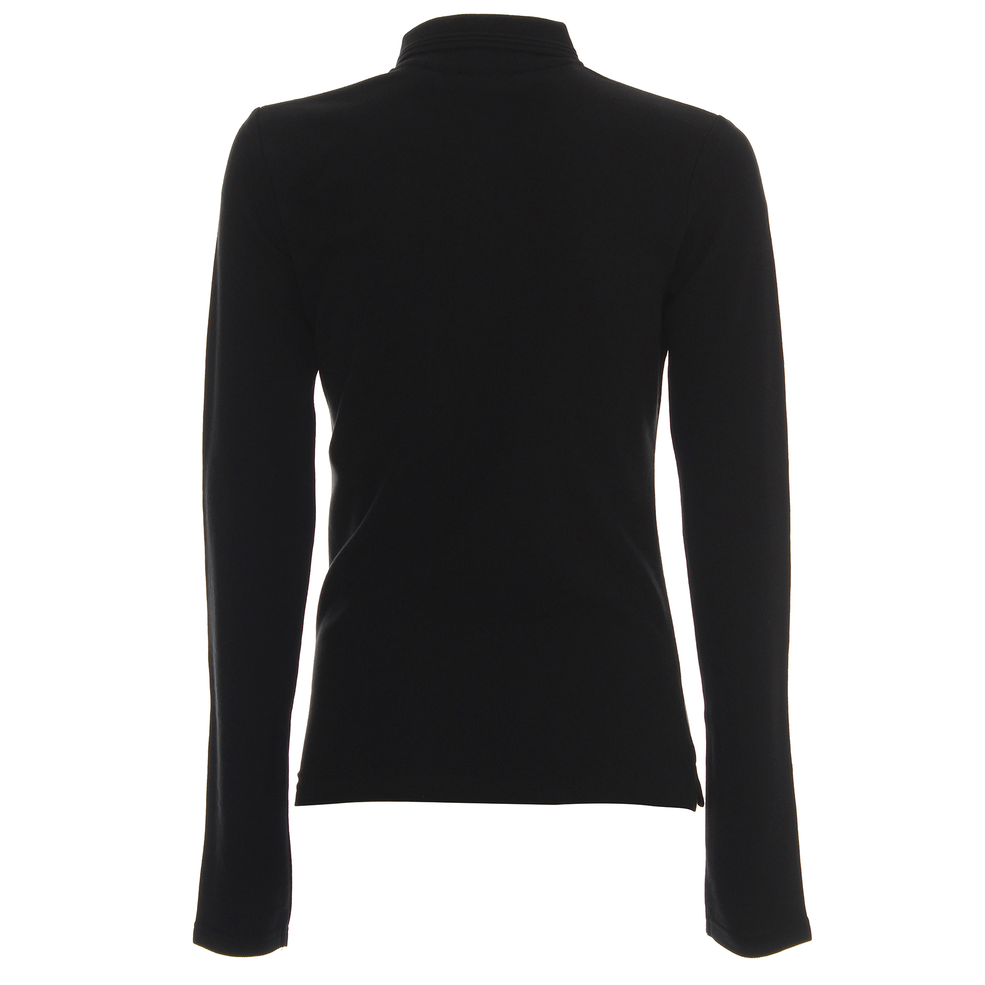 Klasyczny fason; materiał jest miękki i pozbawiony nierówności; płaski kołnierz wykonany ze ściągacza rib 1×1 z podwójnymi strukturalnymi paskami; kołnierz i ramiona z taśmą wzmacniającą i stabilizującą, która pozytywnie wpływa na trwałość szwów; rozcięcie na bokach wykończone taśmą wzmacniającą od wewnątrz; trzy guziki; podwójne, gęste szwy do których wykorzystano nici najwyższej jakości